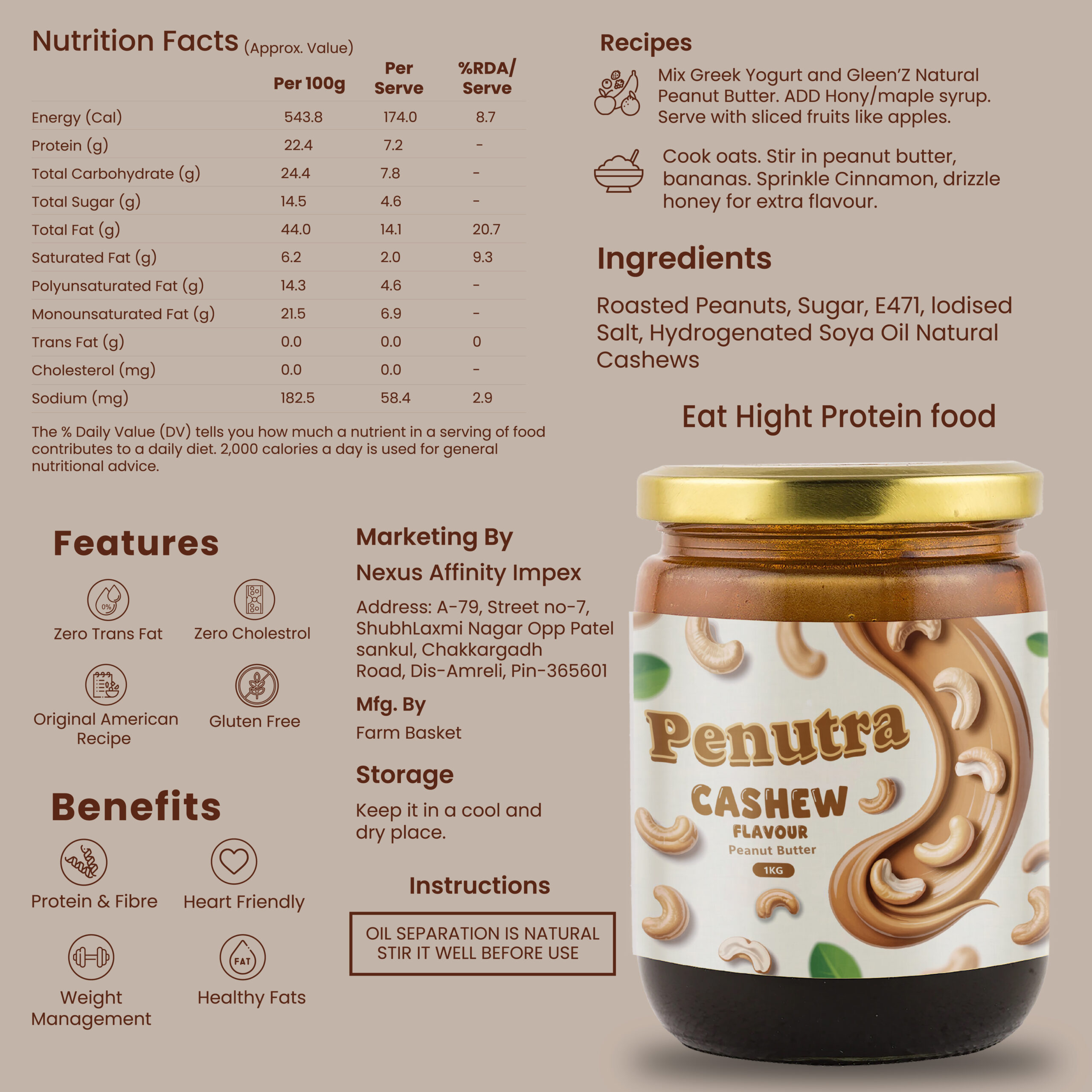 Cashew Peanut Butter is a creamy combination of roasted peanuts and cashews, offering a buttery texture and mild sweetness. It’s an excellent source of plant-based protein and healthy fats, making it perfect for breakfast spreads, smoothie bowls, or guilt-free snacking.